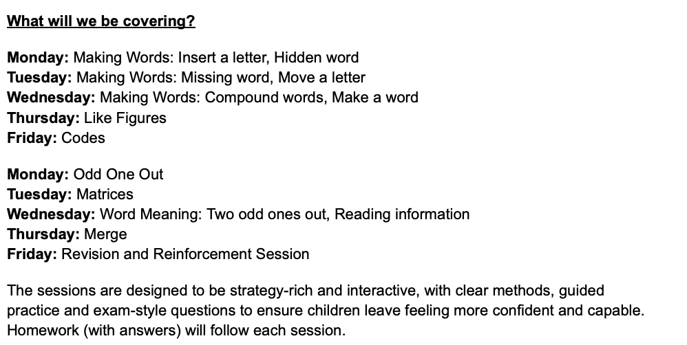 This one-week course focuses on core 11+ reasoning foundations that children need repeated, guided practice with.